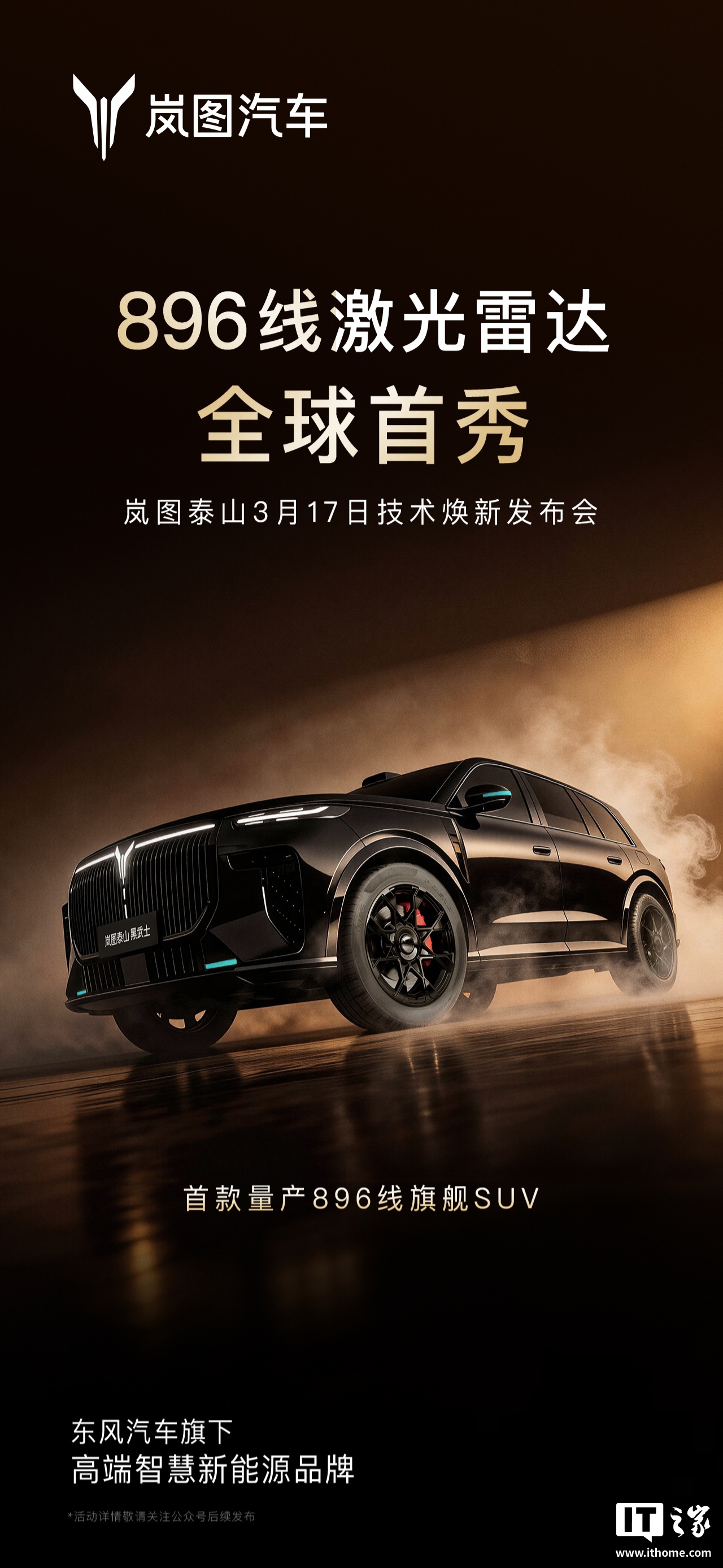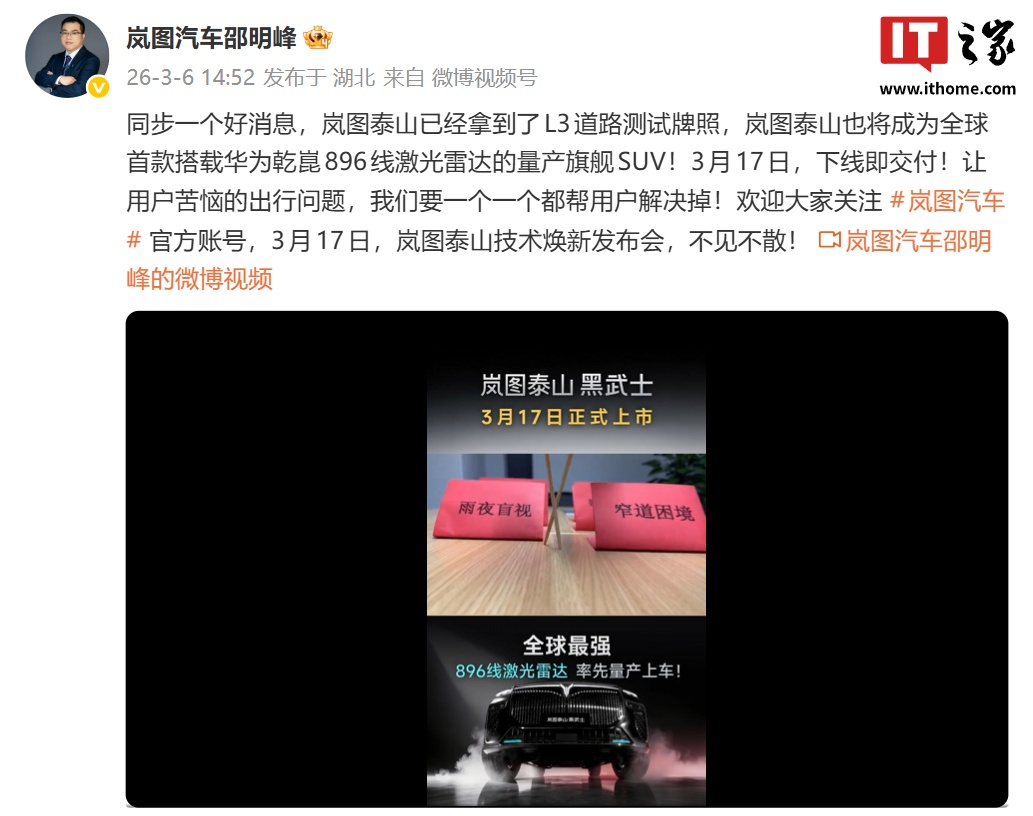 岚图汽车邵明峰:泰山已获 L3 道路测试牌照,将成全球首搭华为乾崑 896 线激光雷达量产旗舰 SUV